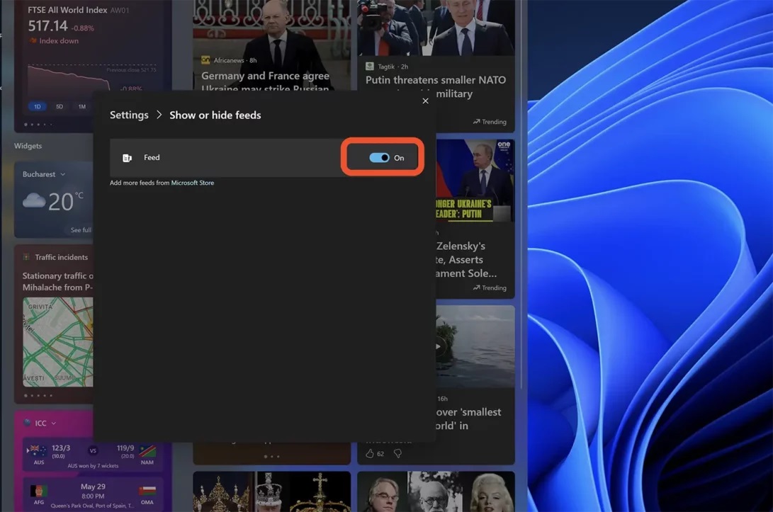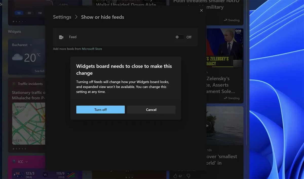 4. V dialógovom okne, ktoré sa otvorí, kliknite na tlačidlo „Vypnúť“, čím potvrdíte, že chcete zakázať informačné kanály z miniaplikácií Windows 11.